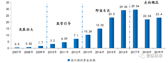 随着2003年中国银行推出第一款外币理财产品“汇聚宝”、2004年光大银行发布第一款人民币理财产品“阳光理财B计划”,国内银行理财业务拉开帷幕。近年来,我国银行理财业务一直在曲折中发展,大致经历了萌芽发展、发展壮大、监管引导、野蛮生长和走向规范五个阶段。