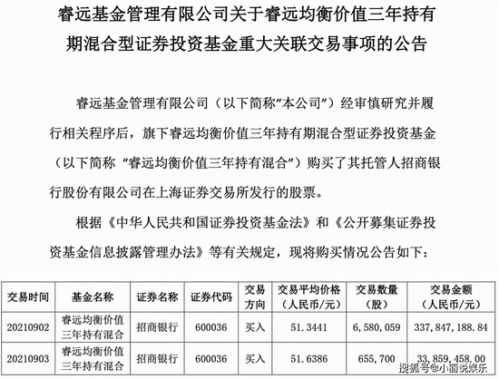 无独有偶,另一位明星基金——睿远基金赵枫管理的睿远均衡价值曾在9月2日及9月3日两个交易日连续买入招商银行,合计买入723.58万股,买入金额达到3.72亿元。