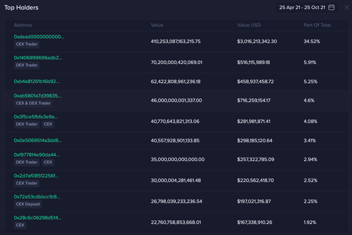 据Santiment数据显示,截至25日,排名前10位的SHIB地址的持仓量,占据了SHIB总供应量的67.39%以上。在7月末,大于百万美元SHIB资产的大户持仓量一度飙升至80%。上周四,曾有SHIB大户抛售。由于SHIB价格在周末反弹,SHIB社区发布“巨鲸”(大户)不控制SHIB的言论。就目前的大户持仓量占比而言,“庄家”操控的可能性仍存在。