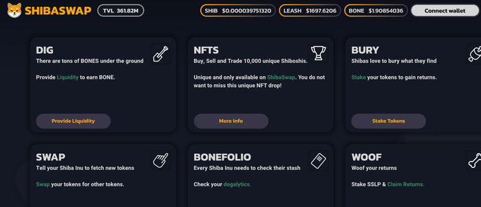 SHIB被认为是狗狗币的衍生代币,在SHIB社区内,则将其称为狗狗币杀手。除了一些来路不明的消息、以及模棱两可的解读,在SHIB官网,旗下去中心化交易所SHIBASWAP页面介绍部分应用,有流动性质押挖生态代币BONE、以及可销售1万个Shiboshis NFT,柴犬币生态还发布了代币LEASH。NFT通常由中心化平台发行,SHIBASWAP自诩为去中心化交易所,SHIB匿名创建者Ryoshi真实身份未对外界公布。