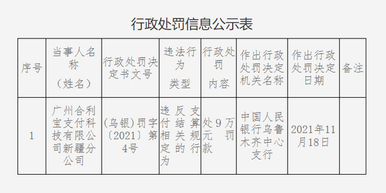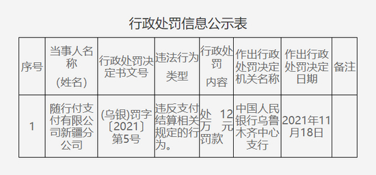 日前,中国人民银行乌鲁木齐中心支行发布两则行政处罚信息表显示,随行付支付有限公司新疆分公司(下称“随行付”)、广州合利宝支付科技有限公司新疆分公司(下称“合利宝”)均因违反支付结算相关规定遭行政处罚,分别被罚没12万元、9万元。