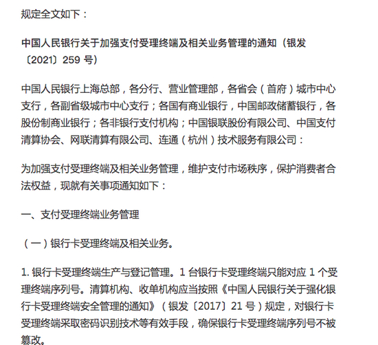 2021年10月13日,央行官网发布《中国人民银行关于加强支付受理终端及相关业务管理的通知(银发〔2021〕259号)》,从支付受理终端业务管理、特约商户管理、收单业务监测三个方面入手,对收单机构和清算结构提出了一系列的管理要求。与此同时,条码支付也被纳入监管,对个人收款条码的使用规范做出具体规定,并将于2022年3月1日起施行。