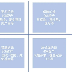 即家庭资产应该分成四个账户,分别是10%的资产配置到要花的钱、20%的资产配置到保命的钱,30%的资产用于生钱的钱,剩余40%的资产用于保本升值的钱。