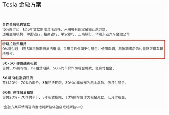 记者注意到,去年11月1日,特斯拉中国就曾推出了“0”首付、最长5年的弹性融资租赁购车方案,有身份证和驾照即可申请。不过,该政策上线仅仅三天后,就被特斯拉紧急叫停。11月4日,特斯拉重新对融资租赁的购车方案进行调整,首付变成了10%起,并取消了零首付的政策。对此,特斯拉的官方解释是“新车订单量较大,担心消费者等待提车的时间较长影响用户体验,因此取消了该方案。
