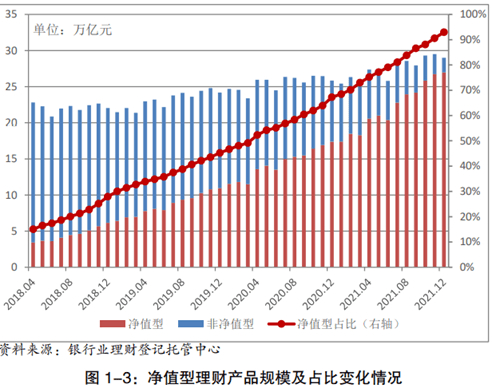 《报告》显示,截至2021年底,银行理财业务过渡期整改任务已基本完成。保本理财产品规模已由资管新规发布时的4万亿元压降至零。净值型产品比例大幅增加,截至2021年底,净值型理财产品余额26.96万亿元,占比92.97%,较资管新规发布前增加23.89万亿元。因此,有人称大资管正式进入“净值新时代”。