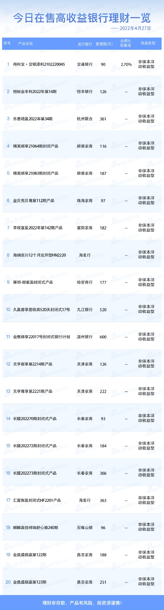 4月27日在售高收益银行理财产品一览。今日业绩比较基准在2.70%及以上的银行人民币理财产品共1款。理财非存款、产品有风险、投资须谨慎!