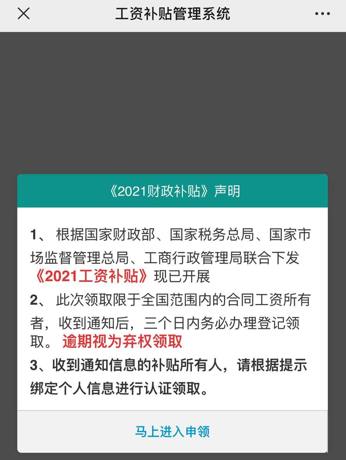 根据邮件的二维码进入网页之后,客户发现是一个名为“工资补贴管理系统”的页面,首页就注明了依据的国家文件和声明,看起来还挺正规。但是后面的操作需要绑定各类身份信息,这就让他心生疑惑,产生了警觉,所以第一时间询问了负责代发工资的银行,就找到了我。