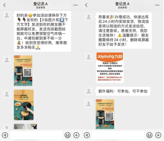 受邀通过之后,一个名为“登记员”的“工作人员”会客气地询问是不是参加领取空气炸锅活动。在得到肯定的答复后,“登记员”让我发第一条朋友圈,内容和之前同事发的一致。