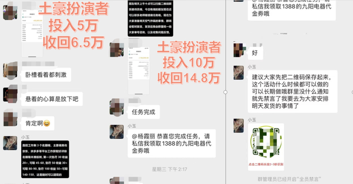 聊天记录里的金额越来越大,随着某“群友”相继投入5万、10万大额资金并收回不菲的返利后,“剧本”表演结束,群主开启了全员禁言。