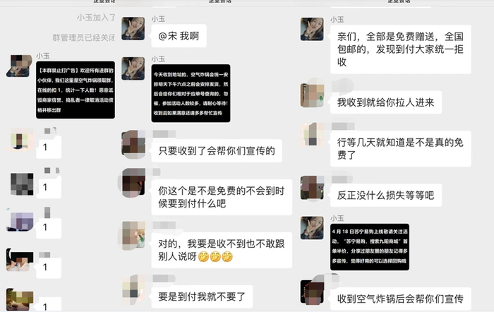 入群后,会发现参加活动的“群友”们七嘴八舌把自己的质疑都问了,给人一种“大家和你都在一条船上”的感觉。到目前,群消息的重点还是在空气炸锅上。