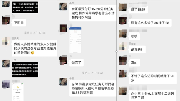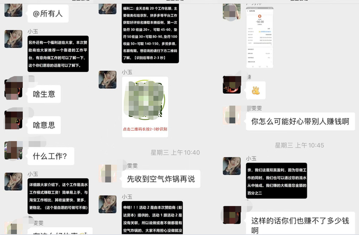 在炸锅邮寄的话题得到确认之后,群主甩出了铺垫这么久的真正目的——刷单返利诈骗。“群友”变“群托”秀演技的时刻到了。