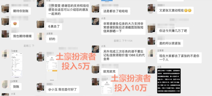 一个账号扮演“土豪”,陆续抛出更大额的投资截图,以日赚过万的噱头诱导受害者头脑发热;剩下的都是“群演”,负责发布小金额截图、即兴打圆场、接茬起哄、烘托气氛等等,以加强真实性。