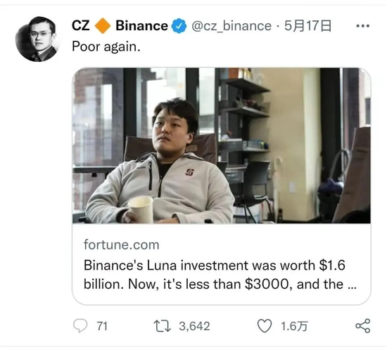 此外,受加密货币暴涨暴跌影响,赵长鹏身价波动异常剧烈。今年5月17日,赵长鹏转载了一条有关币安投资Luna币的报道并评论道:返贫了(Poor again)。