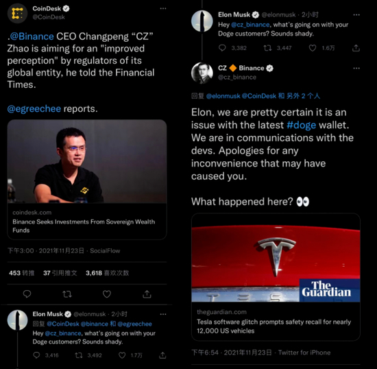 之前,马斯克在币安遭遇提币问题后,在社交平台质问赵长鹏。赵长鹏先是马上道歉,说都是狗狗币钱包惹的祸,随后又转发了一条特斯拉故障的新闻,暗戳戳把马斯克按到地上摩擦。