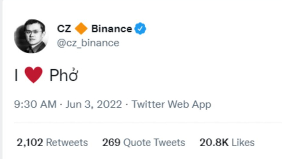 2022年6月3日,赵长鹏发了一条推特:“我爱河粉”。