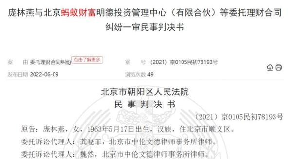 判决书显示,庞某燕在2017年2月向蚂蚁财富中心的账户转账支付投资款350万元,用于投资蚂蚁财富的项目,期限为一年。在项目到期后,蚂蚁财富支付了该笔投资的收益,投资款本金则转投到本案合同项下。