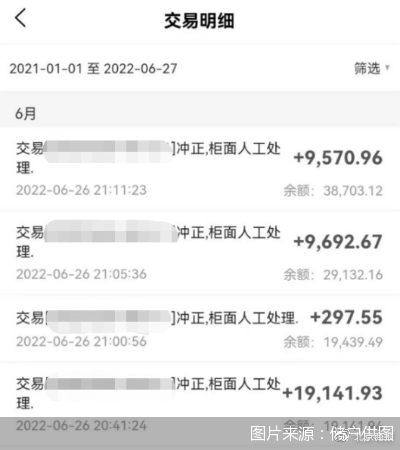 “6月26日13时左右,我听到有消息说开封新东方村镇银行能提现了,随即就试了一下,发现确实能提现,系统也和之前一样恢复正常。不过,平时提现只需要半小时左右就可以转移到I类卡,这次我等了一个小时也没有到账。”储户王影(化名)回应称,“一直到6月26日晚20时40分-21时11分左右,这4笔资金又回到了我的银行电子卡,均显示:冲正,柜面人工处理。”