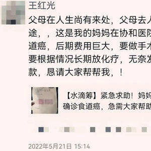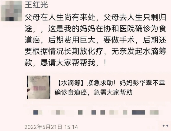 “这是我妈妈,在协和医院确诊为食道癌……无奈发起水滴筹款,恳请大家帮帮我!”2022年5月21日,王红光在朋友圈发布了第一条筹款链接。一天内,他收到了8000多元捐款,这让正为治疗费用发愁的王红光感到些许欣慰。
