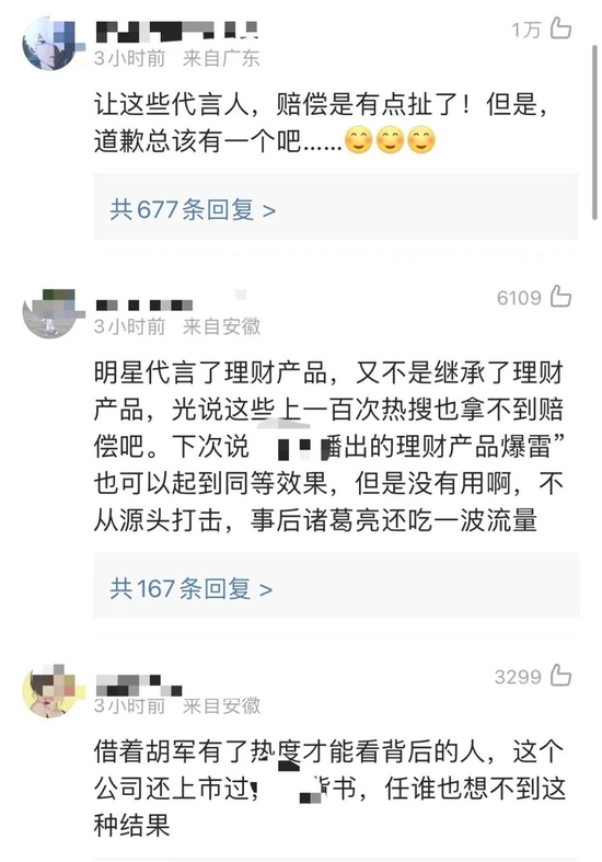 近两年来,不断有悟空理财的出借人在胡军的微博下“讨公道”,但胡军始终保持沉默。不过,也有网友表示,胡军的代言在前述理财产品爆雷前就已经结束,相关争论仍在持续。