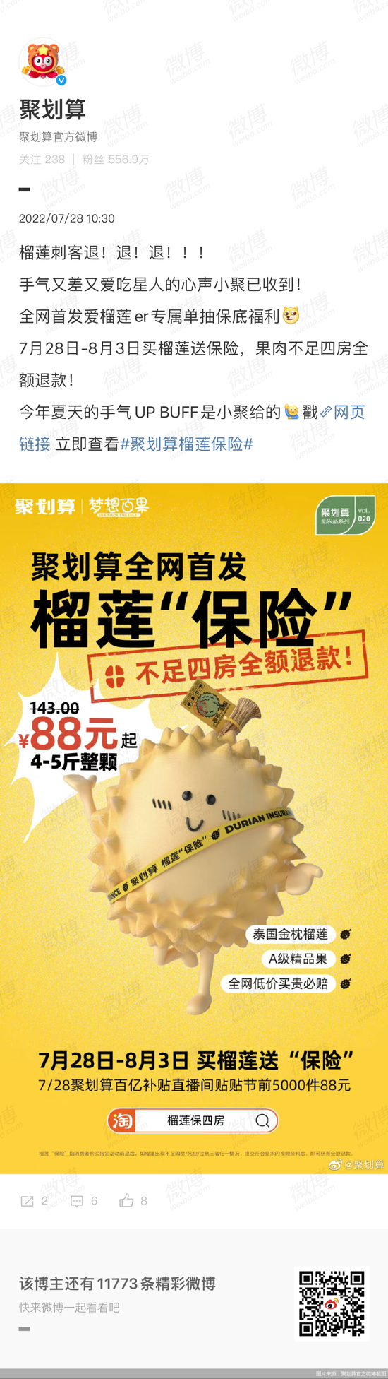 “榴莲刺客退!退!退!7月28日-8月3日,买榴莲送保险,果肉不足四房全额退款!”北京商报记者了解到,近日,聚划算官方微博发布信息显示,聚划算全网首发榴莲“保险”。
