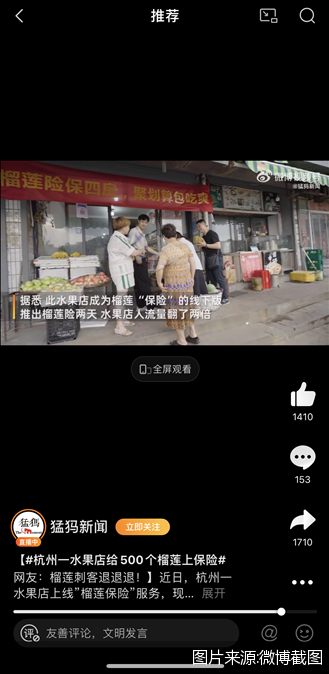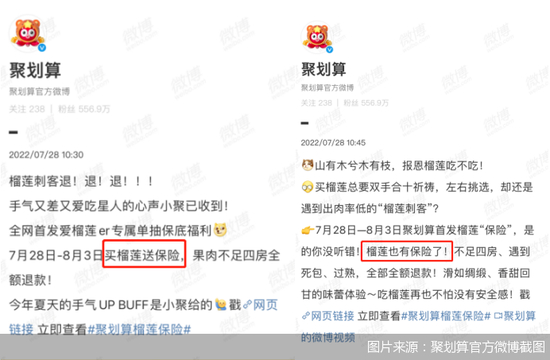不过,虽然画着榴莲的榴莲“保险”海报和榴莲“保险”宣传视频中对保险二字加了双引号,但聚划算官方微博的宣传文案中,“买榴莲送保险、榴莲也有保险”等表述却未对保险二字加双引号。