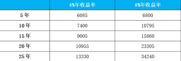 注:该计算采用复利计算,假设收益率在4%、8%的不同年限下可累积的金额。本测算仅用作示例说明,收益率仅为模拟测算使用,不预示未来。
