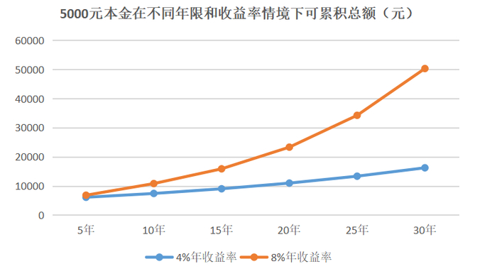假设单笔5000元本金,如果投资年收益率为4%和8%。从以下测算图表可以看到,投资期限越长、年收益率越高,在复利效应的推动下,钱“生”出来的钱就越多。尤其是随着时间的推移,投资期限的拉长,曲线更加陡峭,财富积累速度也会越来越快。