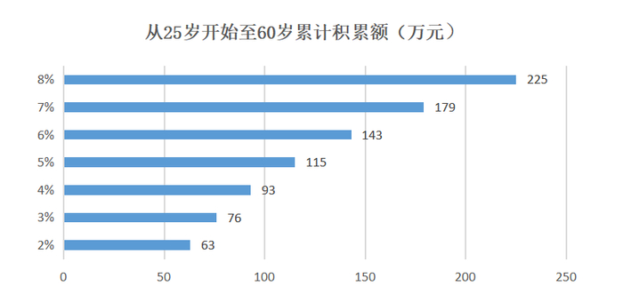 可以看到,即便一年12000元(相当于月均1000元)的养老储备积累,若年投资收益率5%,在复利“魔力”的推动下,60岁时的总积累金额也可达到115万元;若年投资收益率达到8%,60岁时的总积累金额更是可触及225万元!