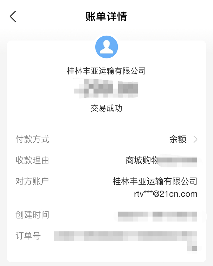 在查看第二次购入“国债”的收款方时,奇怪的事情又出现了。支付宝账单信息显示,这次的收款方又变成了桂林丰亚运输有限公司(下称“丰亚运输”)。