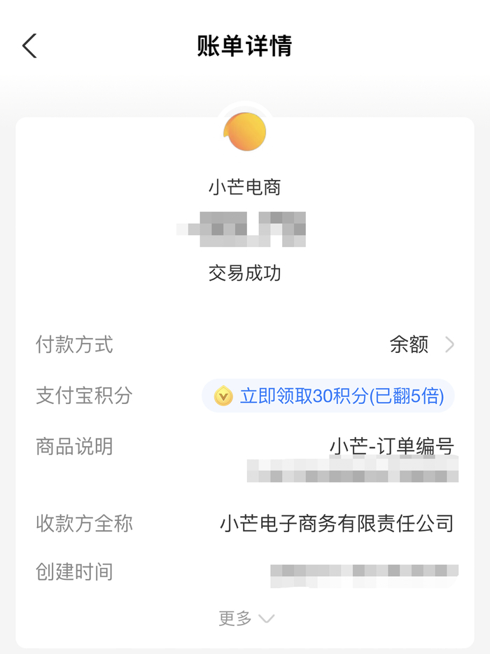 支付宝历史账单显示,第一次的收款方是小芒电子商务有限责任公司(下称“小芒电商”)。