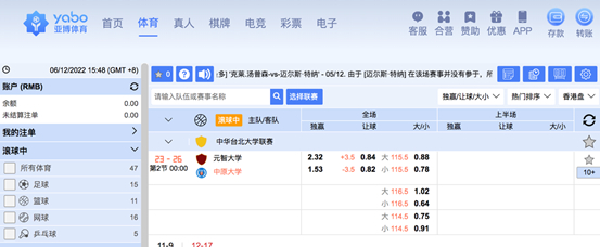 在亚博体育官网,展示的体育比赛类型涉及足球、篮球、兵乓球、网球、板球、冰上曲棍球等多种。以足球赛事为例,除了当前火热的世界杯外,还包括各俱乐部联赛、友谊赛以及地区球队赛事,单场比赛设置的竞猜方式多达10余种。在篮球赛事中,还出现了部分大学联赛。