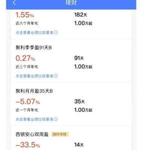 日前,有多位投资者在社交平台上表示,自己购买的西安银行理财产品亏损严重。其中一张由投资者提供的截图显示,截至某日,西安银行“西银安心双周盈”产品七日年化收益率为-33.5%,“西银安心周周盈”产品七日年化收益率为-23.01%。