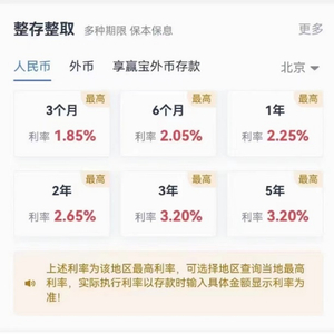 江苏银行北京地区整存整取的定期存款利率。来源:江苏银行手机银行