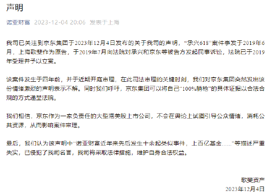 对此,诺亚财富晚间发布声明称,已关注到京东集团于2023年12月4日发布的关于我司的声明,“承兴618”案件事发于2019年6月,上海歌斐作为原告,于2019年7月向法院对承兴和京东等被告方发起民事诉讼,法院已于2019年受理并予以立案。该声明中“诺亚财富近年来先后发生十余起类似事件,上百亿基金......”等描述严重失实,已侵犯了我司名誉,我司将采取法律措施,维护自身合法权益。