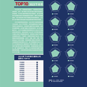 2023年下半年度TOP 10银行理财公司“产品风控”竞争力排名依次为:民生理财、光大理财、中银理财、平安理财、农银理财、交银理财、兴银理财、招银理财、宁银理财、信银理财。