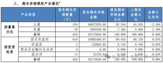 截至2023年末,浦银理财存续理财产品629只,其中固收类产品610只,权益类产品5只,混合类产品14只,截至2023年末浦银理财的产品存续金额为9517.50亿元。
