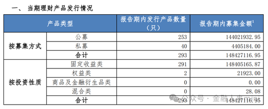 报告显示,2023下半年,浦银理财新发理财产品293只,从募集方式来看,其中公募理财产品253只,私募理财产品40只;按投资性质来看,固收类产品占多数,其中291只为固收类产品,剩余两只为权益类产品。