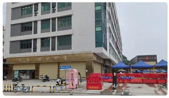 8月7日,第一财经记者来到位于广州与佛山交界处的泛茶研发中心,这里已经被警戒线围住,周围多家泛茶加盟店以及处于同一栋楼的泛茶交易平台都已大门紧闭。