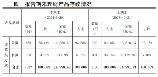 建信理财上半年理财报告显示,截至2024年6月末,公司理财产品存续规模为14,998.48亿元,仅比上年末微增0.05%。具体来看,建信理财公募产品规模14,050.5亿元,占比93.68%;私募产品规模为947.98亿元,占比6.32%。