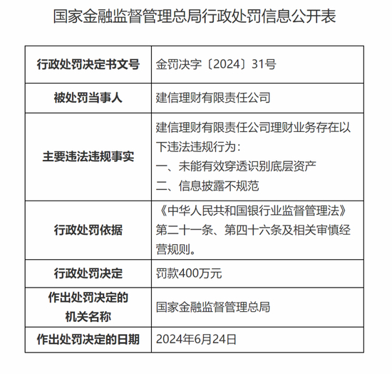 今年6月28日,国家金融监督管理总局行政处罚信息公开表显示,建信理财有限责任公司理财业务存在未能有效穿透识别底层资产;信息披露不规范的违法违规行为,被罚款400万元,作出处罚决定的日期为2024年6月24日。