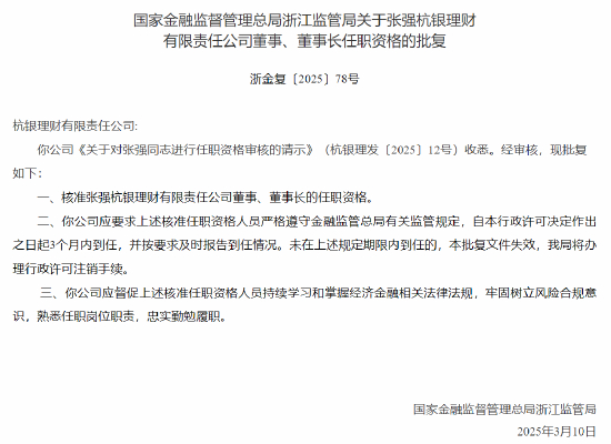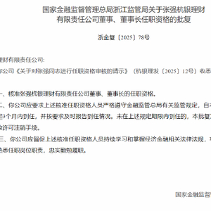 3月12日金融一线消息,国家金融监督管理总局浙江监管局近日发布批复,