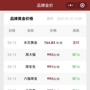 事实如何?《金融时报》记者观察到,5月13日,国内金饰价格确实存在普遍下跌的现象,单克纷纷跌至千元以下。据实时金价统计,5月13日黄金首饰价格每克在764元至995元区间(工费另计)。比如,周大福金饰价格为992元/克,周生生为991元/克,老凤祥为995元/克,老庙黄金、菜百首饰跌至990元/克以下,均较前一日下跌7元—16元不等。