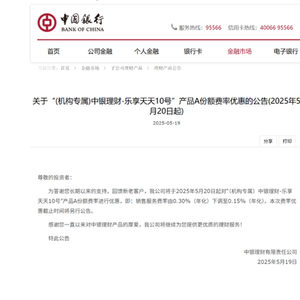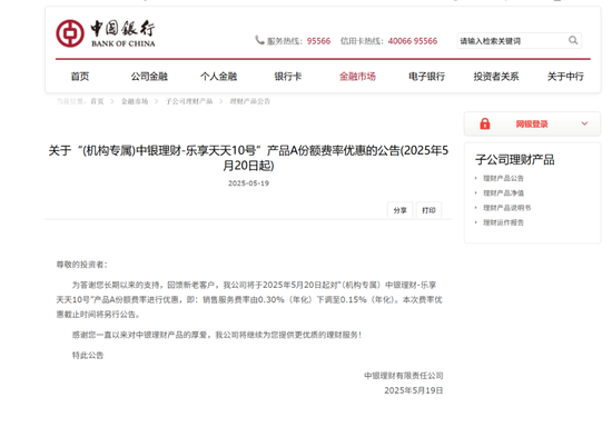 进入5月以来,中银理财接连发布了多条关于理财产品费率优惠的公告。其中,自5月20日起,“(机构专属)中银理财-乐享天天10号”产品A份额费率的销售服务费率由0.30%(年化)下调至0.15%(年化);5月21日至6月21日,“中银理财-怡享天天86号”产品固定管理费率由0.30%(年化)下调至0.05%(年化)。