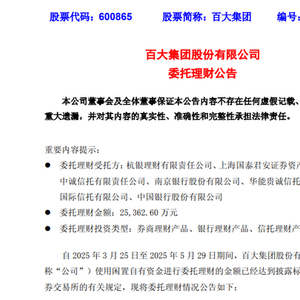 近日,百大集团发布委托理财公告,公告称,自2025年3月25日至2025年5月29日,百大集团使用闲置自有资金进行委托理财的金额已经达到披露标准。