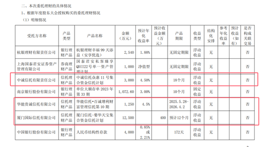 公告显示,本次公司花费约2.54亿元认购理财产品,委托理财受托方中诚信托、华能贵诚信托以及厦门国际信托等三家信托公司。其中购买中诚信托的理财金额为3000万元,具体产品名称为“中诚信托众惠11号集合资金信托计划”,预计年化收益率4.5%;华能信托的理财金额为1250万元,认购的信托产品为“华能信托•百诚增利财富管理信托第10期”,预计年化收益率4.5%;厦门信托的理财金额为1.25亿元,认购的信托产品为“厦门信托-婺华天宝集合资金信托计划”,预计收益400万元。