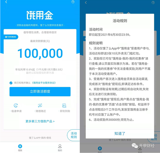 为鼓励从“饿用金”申请借款,饿了么还推出了一个奖励活动,活动时间为自即日起至2021年6月30日,“饿用金”受邀用户将获得3张10元外卖无门槛红包。不过,想要获得该奖励,须完成“饿用金”提现(即获得额度并完成借款),活动奖励共3万份,领完为止。