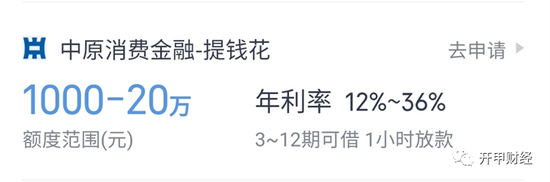 然而,天星金融APP(小米旗下)随星借页面显示,中原消金-提钱花额度范围1000-20万,年利率12%-36%。