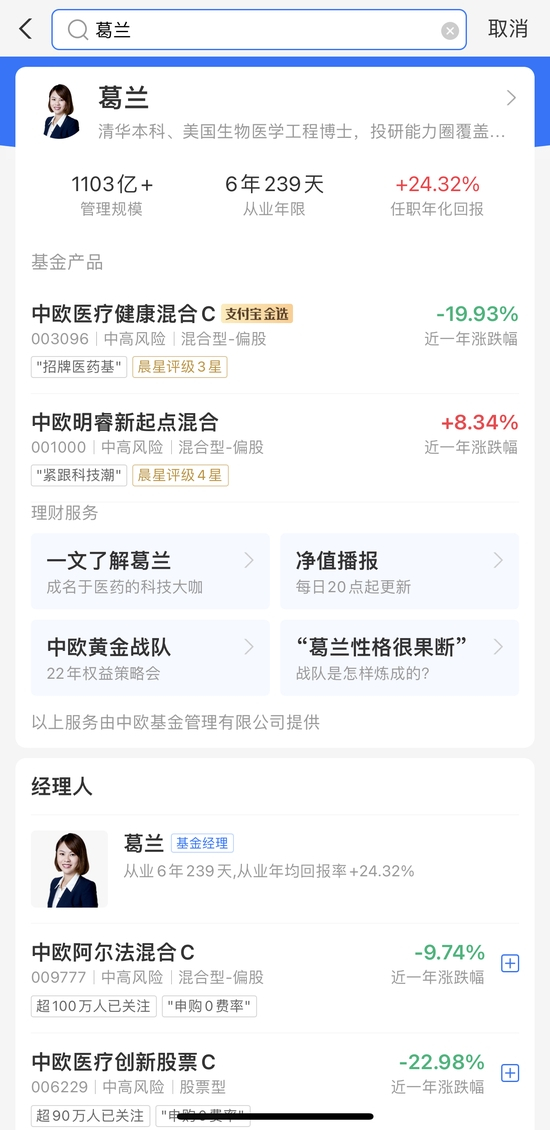 不过,澎湃新闻记者在蚂蚁财富平台搜索“葛兰”时发现,搜索结果提示的产品仍以C类为主,只有当搜索某只产品名,例如“中欧医疗健康”后,才会显示该基金有A/C两类份额,不过在A/C两类份额的购买页面,都会在产品名下方提示不同份额持有市场对应的费率差异。