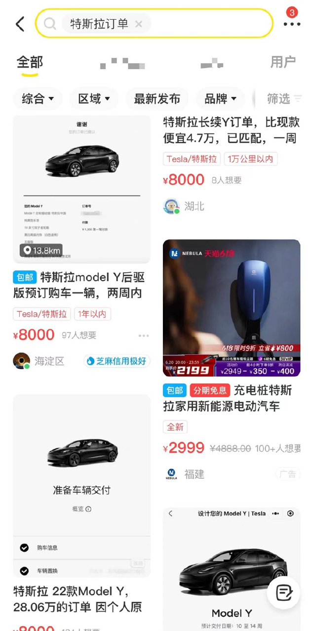 但在有利可图的情况下,不少人也不会在乎这样的风险。《次世代车研所》在某二手平台上发现,不少人均愿意出售自己的特斯拉订单,主要集中在Model Y长续航版,价格均在8000元以上;也有用户愿意出价5000-6000元求购特斯拉订单。