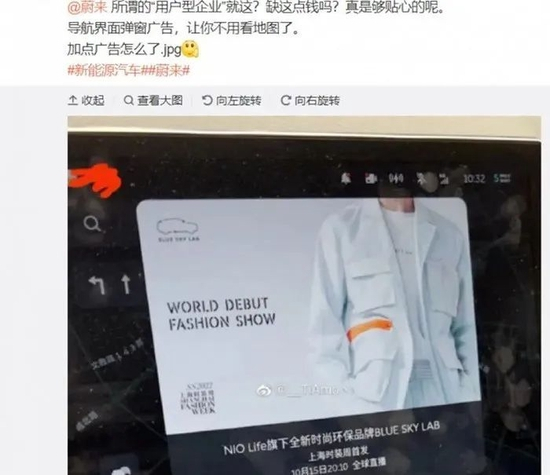 2021年10月,有车主在社交平台上表示,自己的蔚来汽车在导航界面推送弹窗广告,导航界面被弹窗广告所阻挡。